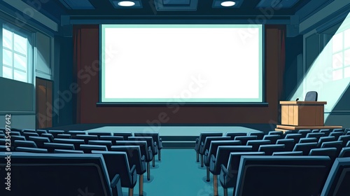 Spacious lecture room with rows of tiered seats, a large blank screen for presentations, and a podium waiting for the speaker.
