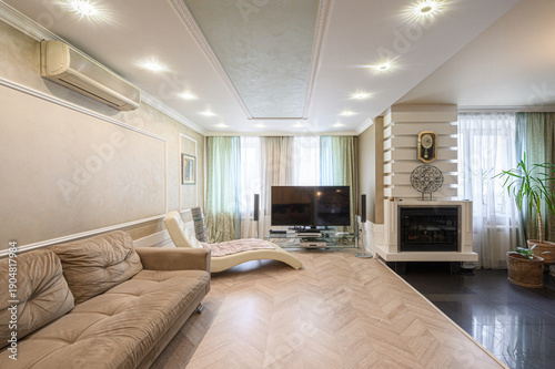 living room, roomy, sofa, beige, television, racked, fireplace, easy-chair, curved, flooring, wood, light, ceiling, light, curtain, sheer, plant, potted, decor, neutral, modern, elegant, ambience, wall, textured, panel, air conditioner, entertainment, zone, glasses, audio system, speaker, ornament, clock, natural light, window, comfort, style, home, aesthetic