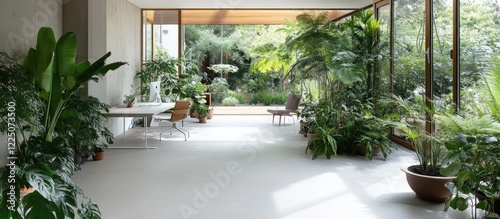 office, minimalist, roomy, natural, light, indoor, garden, plant, workspace, serene, interior, design, architecture, modern, desk, chair, concrete, floor, window, green, foliage, potted, tree, palm, wood, glasses, table, computer, comfortable, calm, relaxing, peaceful, work, environment, home, decor, furniture, bright, open, contemporary
