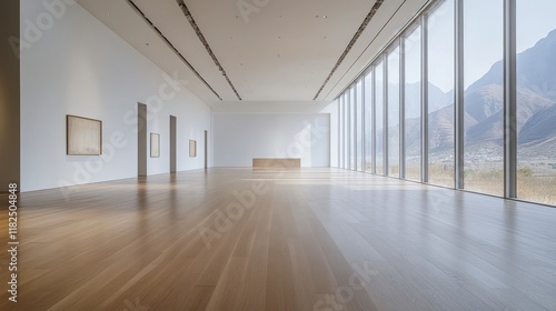 artwork, roomy, clean, wall, serene, wooden, exhibit, open, panoramic, landscape, contemporary, elegance, natural, perspective, light, minimalist, room, artistry, mountain, interior, art, minimalism, aesthetic, zen, installation, space, sunlight, viewing, modern, horizon, bright, vista, window, empty, calm, display, tranquil, design, framework, peaceful, gallery, floor, airy, scenic, architecture