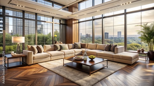 Spacious modern living room interior with large comfortable beige sectional sofa, dark wood coffee table, and floor-to-ceiling windows.