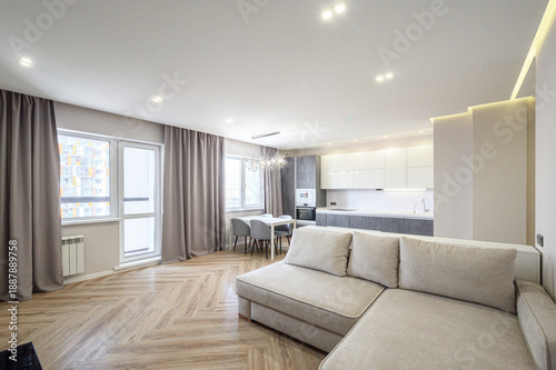 living, room, modern, roomy, sofa, beige, flooring, wood, herringbone, dining, area, kitchenette, window, large, curtain, grey, light, ceiling, chandelier, interior, design, minimalist, style, layout, furniture, space, apartment, contemporary, aesthetic, functionality, storage, countertop, appliance, oven, microwave, sink, table, chair, neutral, tone, decor, practical, home, element, comfort