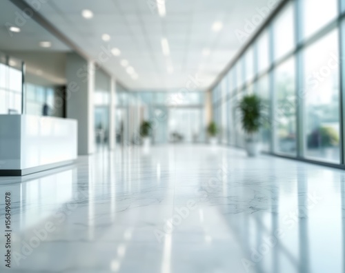 Spacious modern office lobby with marble flooring, large windows, bright lighting, and minimalistic decor creating an airy, professional environment.