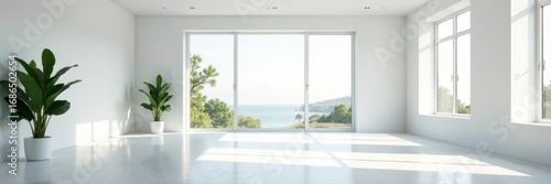 empty, design, panoramic, room, daylight, white, view, modern, window, minimal, glasses, sunlight, architecture, contemporary, apartment, space, blank, wall, bright, light, simple, airy, clean, interior, large, home