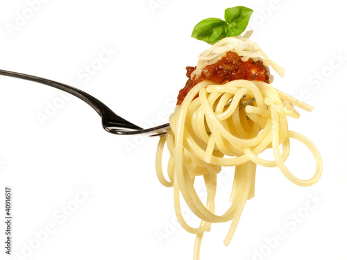 spaghetti, basil, bolognese, fork, yellow, herb, cheese, noodle, noodle, pasta, sauce, isolated