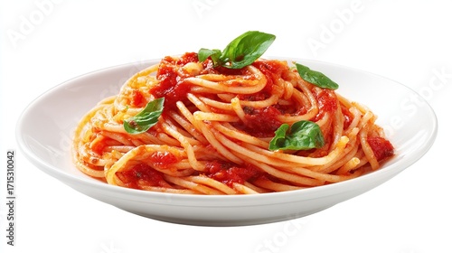 Spaghetti pasta with tomato sauce and basil on a white plate, isolated shot