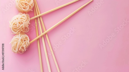 Spaghetti shaped like Easter eggs with chopsticks on pink backdrop Minimal food theme Square design with space for text