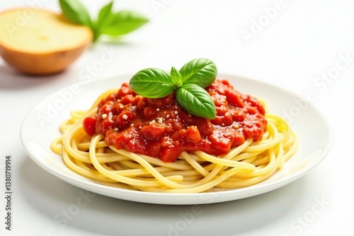 Spaghetti with basil & tomato sauce on white background , isolated, red, spaghetti
