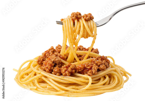 Spaghetti with meat sauce on a fork