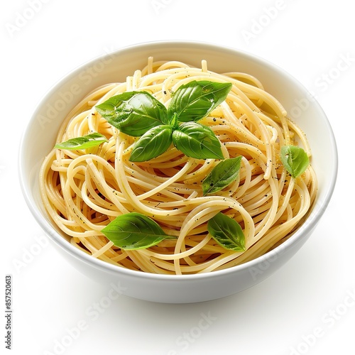 Spaghetti with pesto sauce and fresh basil leaves on white background generated ai image