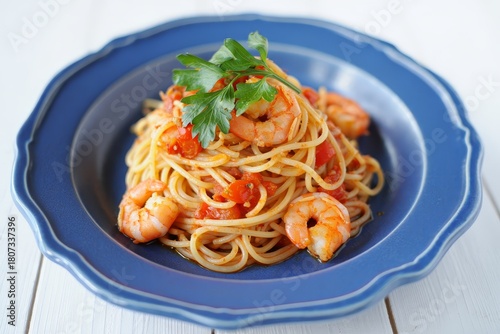 Spaghetti with Shrimp in Tomato Sauce on Blue Plate