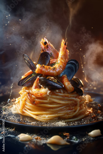 spaghetti with shrimps and mussels italian food