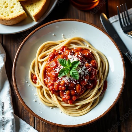 Spaghetti with tomato sauce, basil, and Parmesan served with garlic bread