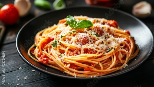 spaghetti, pasta, tomatoes, sauce, parmesan, cheese, basil, food, dish, meal, dinner, lunch, delicious, tasty, deliciously, italian, cookery, cooking, receipe, eatery, plate, dark, background, wood, table, garlic, herb, fresh, healthy, simple, comfort, classic, traditional, home, made, eat, appetising, flavorful, spicey, rich, red, yellow, green, cooked, boiled, vegetable, meatball, serving, portion