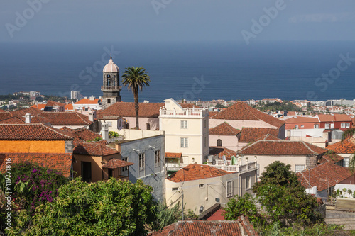 Spain - Canary/Tenerife - La Orotava - The nice aerial panorama view across the roofs and towers of Orotava to the blue ocean water