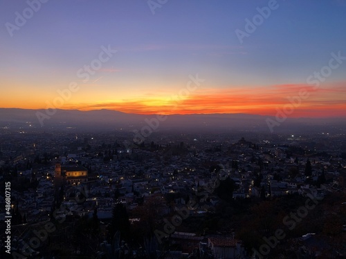 sunset, dusk, setting sun, twilight, evening, night, sky, sunny, cloud, night view, mountain, silhouette, spain, granada, hill, black, orange, white, blue, building, architecture, sunlight, sun, city landscape, city landscape, city, town, nature, plant, landscape, scenery, travel, tour tourism, sightseeing, journey, overseas, europa, andalusia, tree, outdoors
