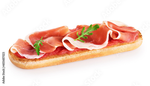 Spanish breakfast. Tostada with ripe tomato and ham (jamon) isolated on white background. With clipping path.