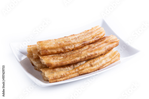 churros, dessert, spanish, food, breakfast, fried, drink, brown, calorie, cookery, cup, sweet, diet, dish, gastronomy, hot, nourishment, snack, sugar, traditional, typical, isolated, white