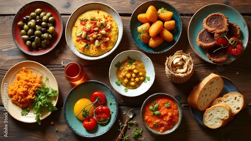 Spanish tapas assortment on rustic wooden table for traditional dining concept
