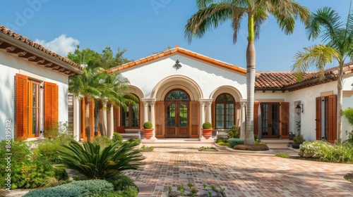 Spanish villa with terracotta Bahama shutters, adding Mediterranean warmth to the sun-drenched facade