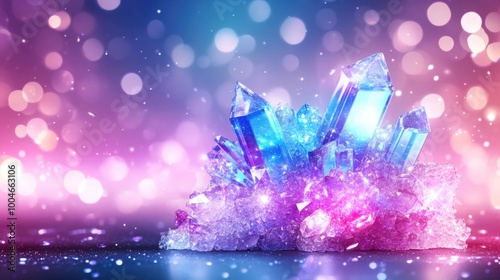 Sparkling blue crystal cluster with magical bokeh background