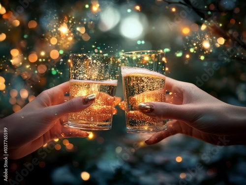 Sparkling Celebration: Two hands clinking champagne glasses against a backdrop of shimmering fairy lights. A toast to new beginnings and joyous moments.
