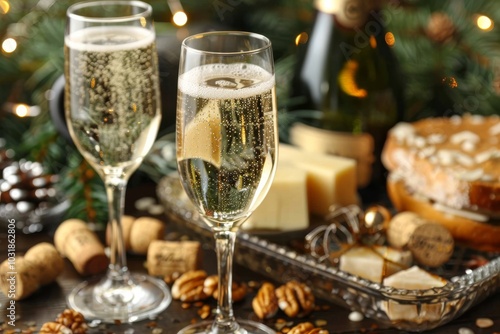 champaign, sparkling wine, celebration, holiday, cheese, nut, cork, treat, party, decoration, puckered, toast, gathering, festive, cheer, holiday season, sparkling, bubbly, new year, festivity, table setting, joy, indulgence, delicious, epicure, elegant, drink