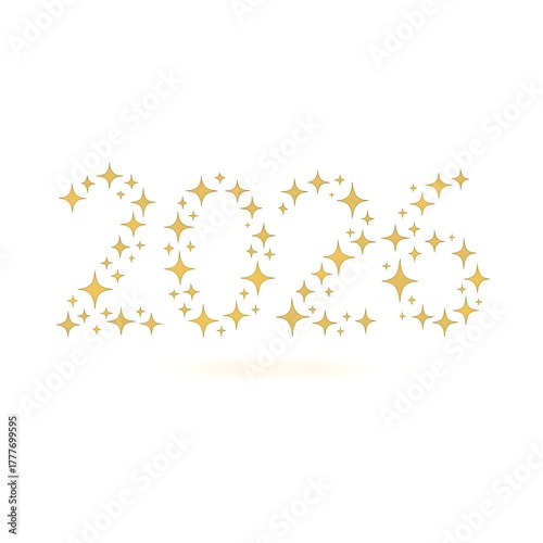 Sparkling golden and silver starbursts artistically form the year 2025 against a clean white background