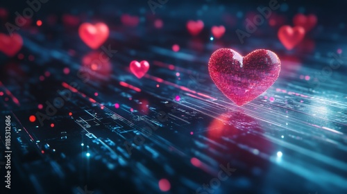 Sparkling Hearts on Digital Background with Glowing Particles