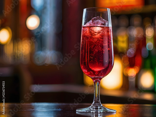 Sparkling Kir Royale Cocktail: A tantalizingly vibrant red cocktail with ice cubes, displayed in a tall glass. The warm glow of the bar behind it creates a captivating ambiance.