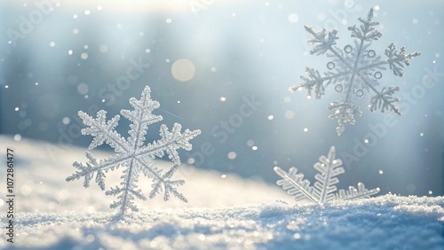 Sparkling snow crystals suspended in mid-air against a soft light background, sparkling, delicate, winter, frosty, snow crystals