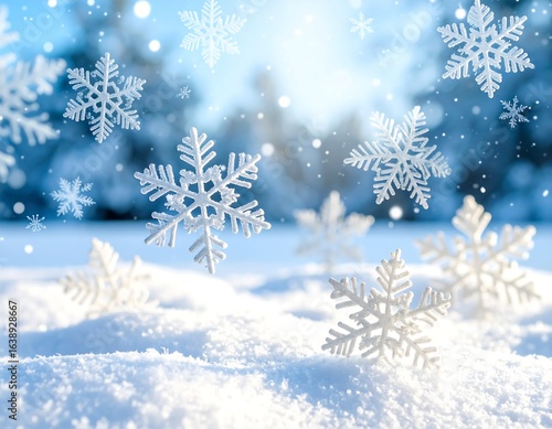 Sparkling snowflakes gently fall onto a snowy landscape, bathed in bright sunlight