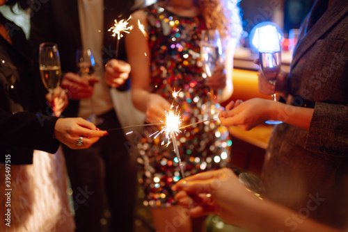 Sparkling sparklers in the hand. Group of happy people holding sparklers at the party. Young friends clinking glasses of champagne in a nightclub. Celebration, people and holidays concept.