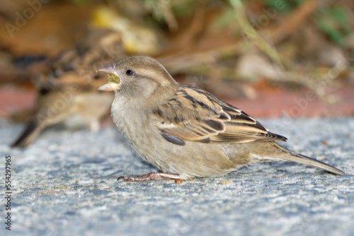 Sparrow on ground eating cat feed.