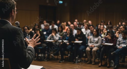 speaker, audience, conference, presentation, meeting, lecture, seminar, speech, talk, public, speaking, communication, business, professional, corporate, event, gathering, people, group, crowd, hall, room, stage, microphone, dais, gesture, interaction, engagement, information, cognition, sharing, discussion, education, learning, workshop, training, convention, forum, assembly