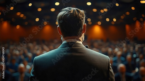 speaker, dais, audience, presentation, conference, seminar, speech, lecturer, meeting, event, business, corporate, leadership, motivation, inspiration, success, training, communication, professional, expert, cognition, information, workshop, group, people, crowd, gathering, participant, support, encouragement, spotlight, stage, light, bokeh, blurred, sharpened, backview, man, suit, formal, backview, hair, grooming, tailored, rear