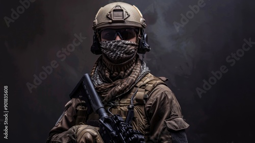 Special forces soldier in full uniform poses in studio background wallpaper AI generated image
