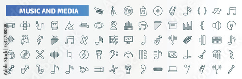special lineal music and media icons set. outline icons such as keytar, dvd disc, eighth note, music triangle, low volume speaker, television screen off, minim, jazz, bold double bar line, half rest
