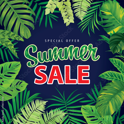Special offer summer sale with tropical palm leaves on blue background template. Vector set of tropical foliage for holiday greetings, voucher, brochures and banners design.