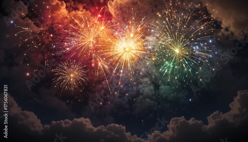 Spectacular colorful fireworks display in a cloudy night sky, a vibrant and joyful holiday celebration