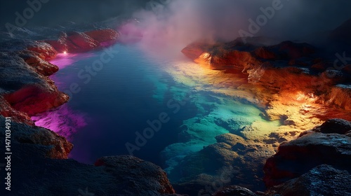 Spectacular rainbow-colored hot spring emanating steam in a volcanic region during twilight