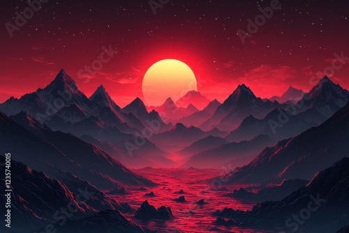 Spectacular red sunset over a surreal mountain landscape with a starry sky
