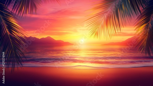 beach, sunset, ocean, palm, tree, tropical, sky, sea, sand, shore, wave, water, horizon, paradise, landscape, nature, view, summer, vacation, holiday, travel, warm, gold, orange, red, pink, cloud, sun, light, beautiful, scenic, idylli, serene, peaceful, calm, relaxing, escape, amazing, vibrant, colours