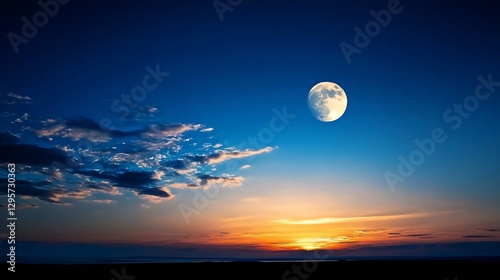 Spectacular view of a full moon glowing over a vivid sunset sky with colorful clouds : Generative AI