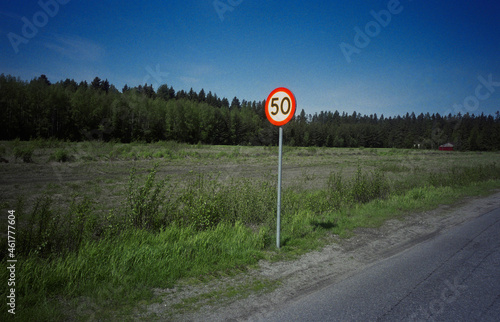 speed limit, 50, kilometre, kilometre, signs, road, roadside, clear sky, color image, outdoors, photo, scandinavian, tree, forest, field