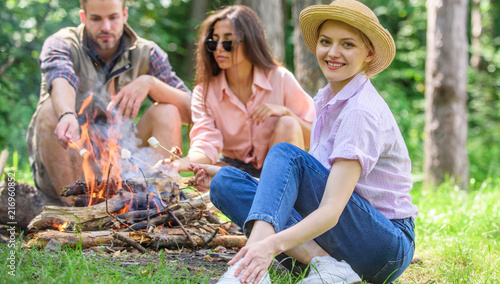 Spend great time on weekend. Roasting marshmallows popular group activity around bonfire. Youth at picnic roasting marshmallows. Company friends prepare roasted marshmallows snack nature background