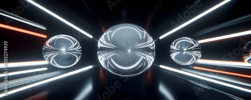 Spherical shapes with inner glow effects, floating and rotating in a space filled with neon light streaks