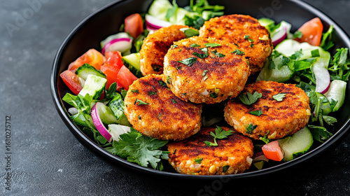 lentil, patty, salad, vegetable, herb, fresh, healthy, cookery, colourful, plate, meal, vegetarian, alimentary, cooking, ingredient, garnished, parsley, cucumber, tomatoes, onion, green, food, dish, appetising, round, crispy, homemade, organic, protein, side