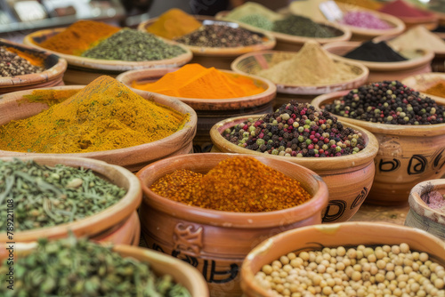 spices in the market. Many different spices and seasonings such as a mixture of pepper, cloves, saffron and curry on a market counter, close-up