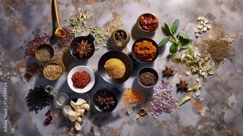 Spices. Photo of fresh herbs. Assortment of fresh and dried seasonings and herbs on a marble background.